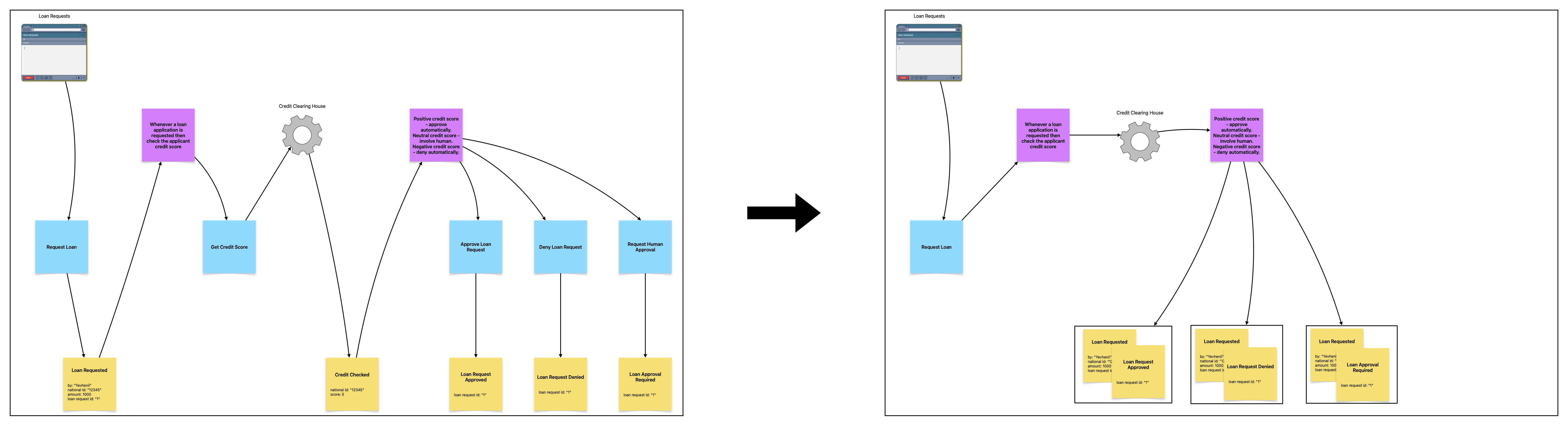 Please notice that there will be no conceptual gap between the diagram and the implementation. It will follow the event model to the letter, creating a powerful medium for stakeholder collaboration.